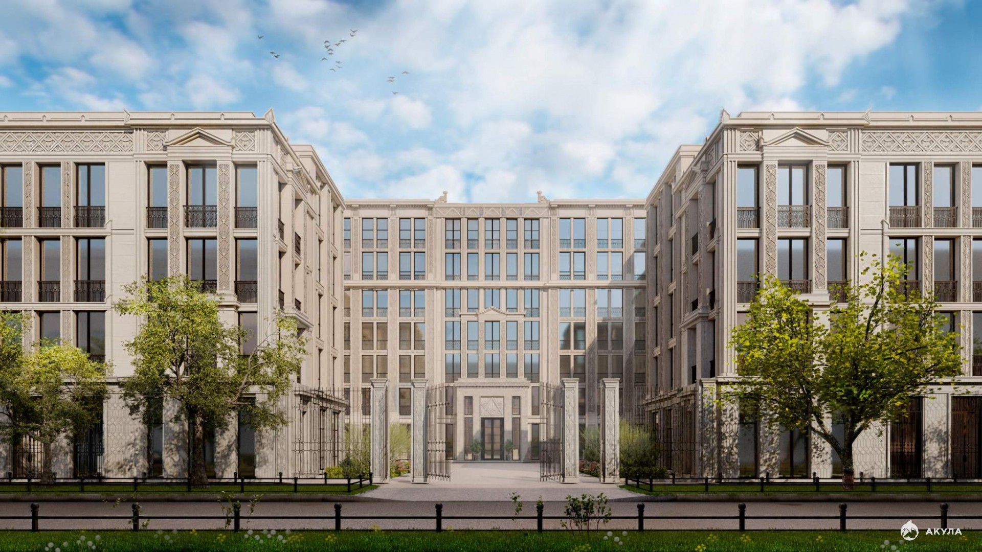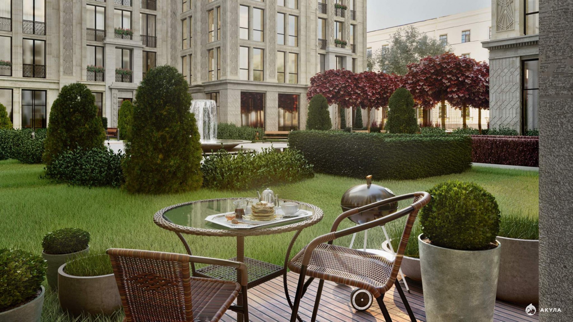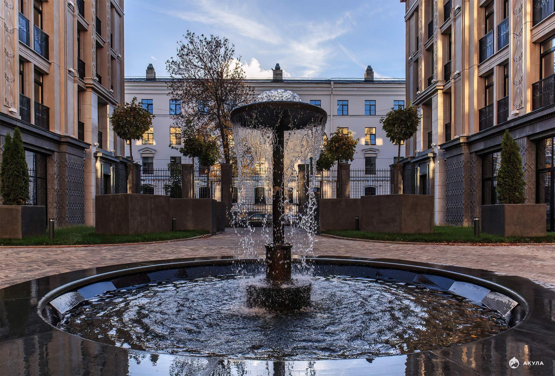 - Редкость для Петербурга - двор-курдонер с изящными воротами, садом, кленовой аллеей и фонтаном создает приватное пространство для избранных