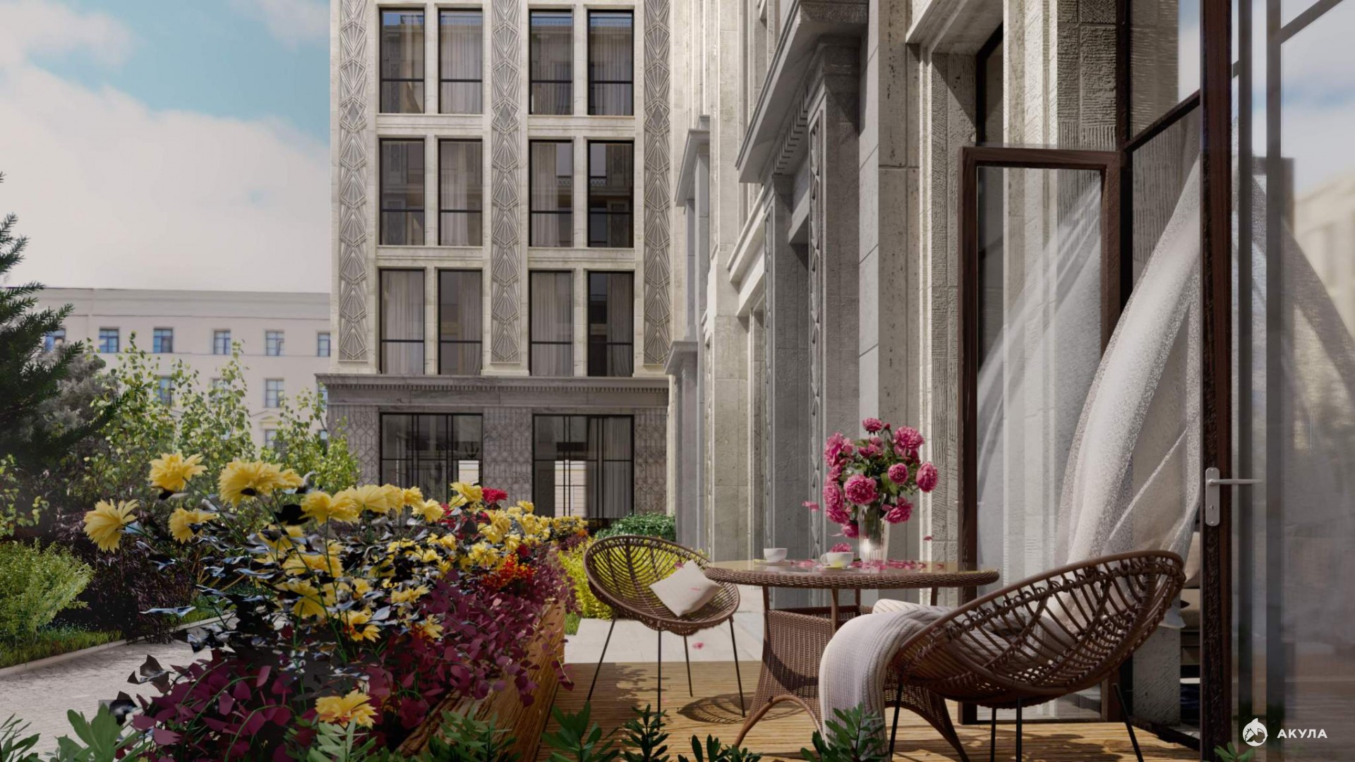 - Авторские фасады ручной работы из технологичного фибробетона, ажурные французские балконы и уступы террас подчеркивают индивидуальность