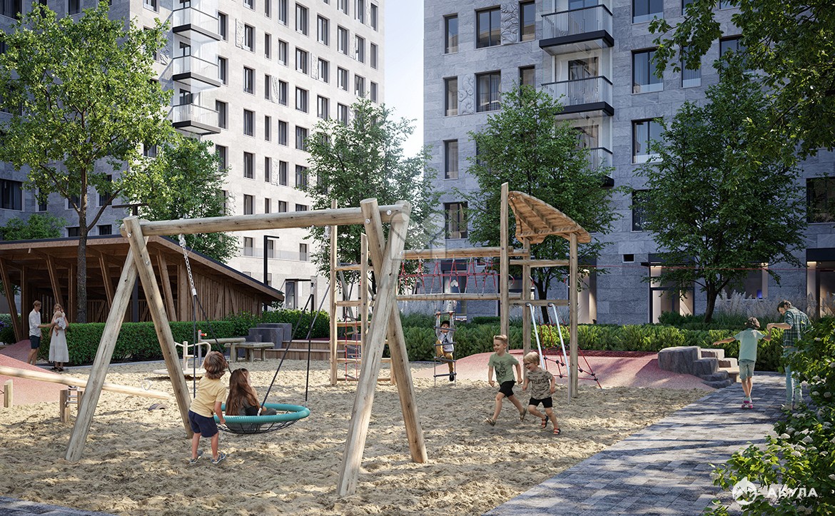 Двор — как парк развлечений: детские площадки с канатной дорогой, зоны для спорта и отдыха с амфитеатром.