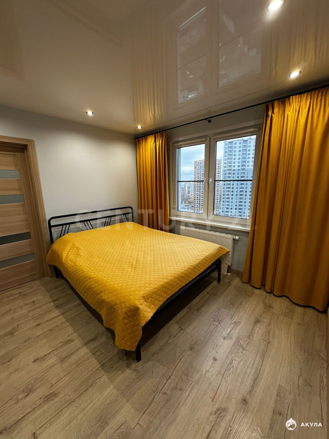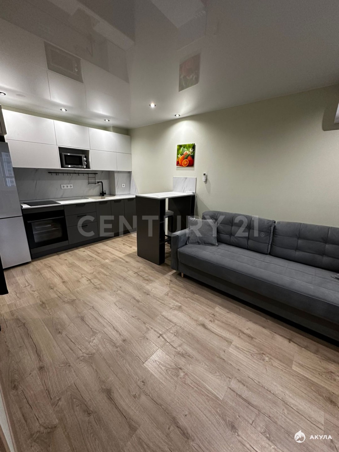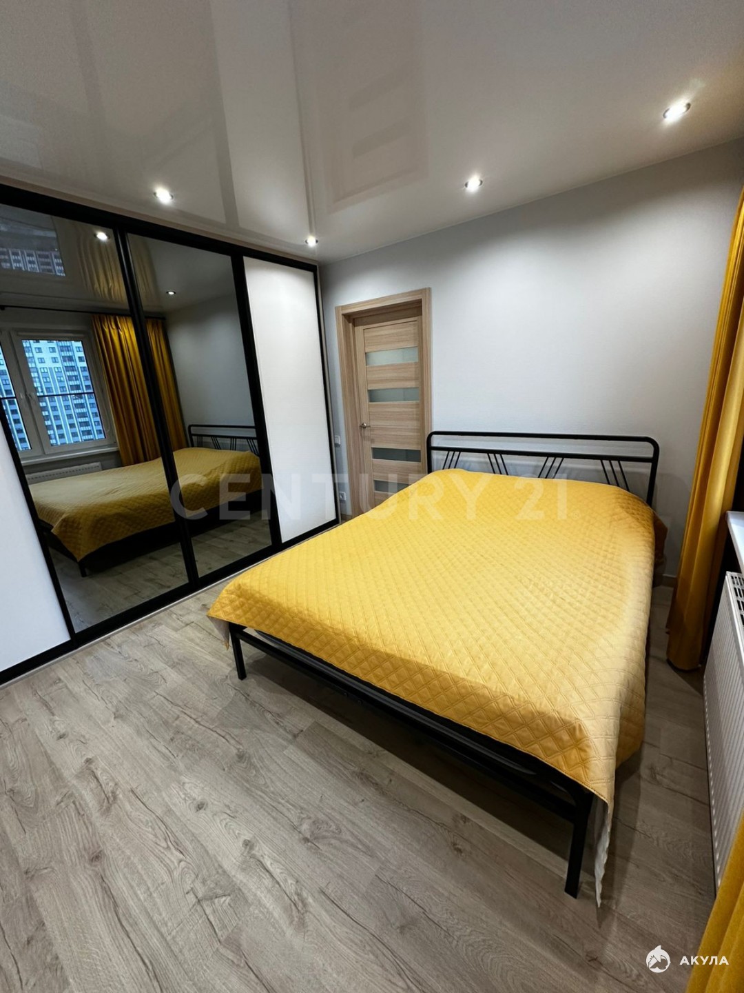 Во всей квартире натяжные глянцевые потолки с точечным поворотным освещением.