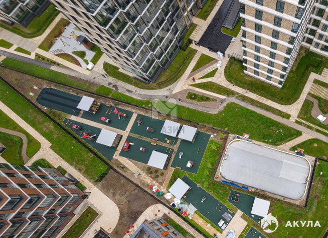 Закрытый двор-курорт: Без машин, только свои. Зелёный оазис, велодорожка 1 км, зоны отдыха, детские площадки и уникальный собственный ледовый каток (зимой – коньки, летом – футбол).
