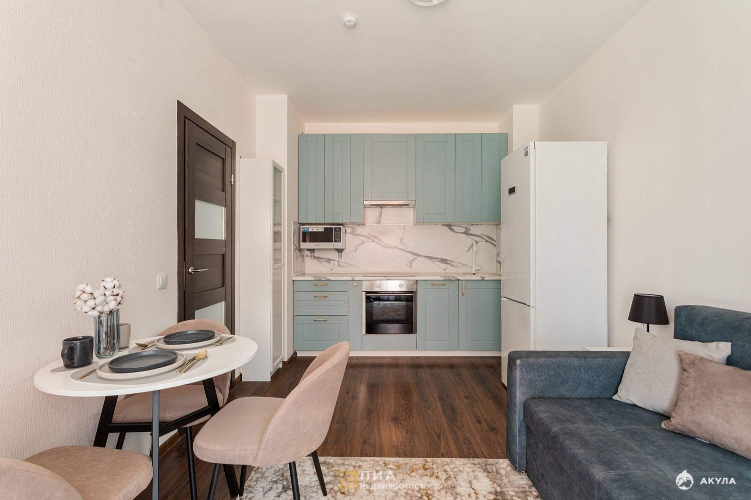 - кухня - гостиная с духовкой, посудомоечной машиной, холодильником и микроволновкой, а также обеденная зона с круглым столом, зона с диваном для отдыха после работы или приема гостей;