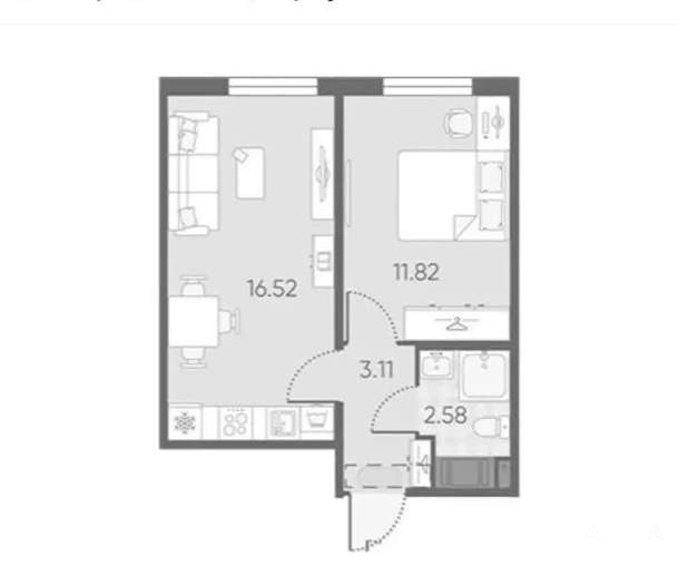 В квартире предусмотрен совмещённый санузел площадью 2, 58 м с ванной.