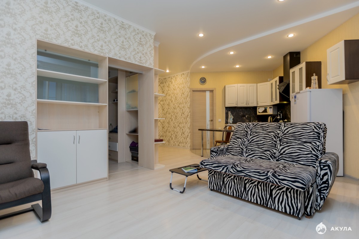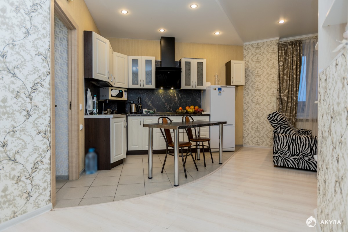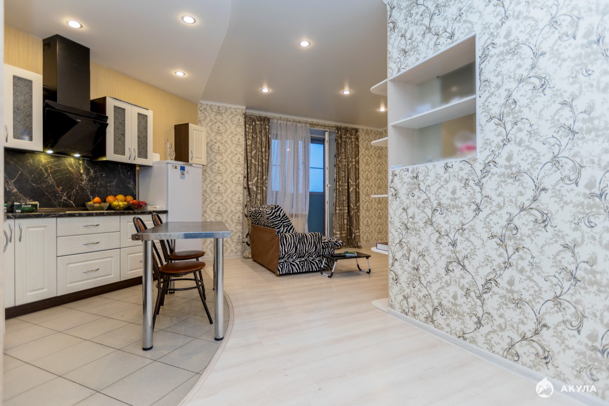 Квартира очень светлая с огромной 4-х метровой, застеклённой лоджией. Комната разделена на две части, одна из которых используется как спальня, а другая как кухня-гостиная. Общая площадь квартиры 43, 2 ка.метра, жилая комната —30 кв.м. Санузел большой, совмещенный. Квартира продается с бытовой техникой (стиральная машина-автомат, двухкамерный холодильник, СВЧ печь, электрическая плита с духовым шкафом, мощная вытяжка). В ванной и в зоне кухни установлена система теплый пол.