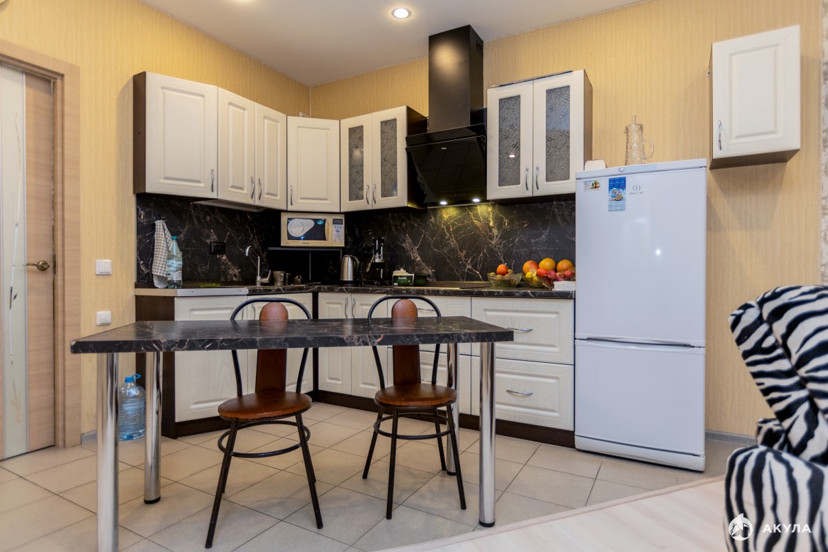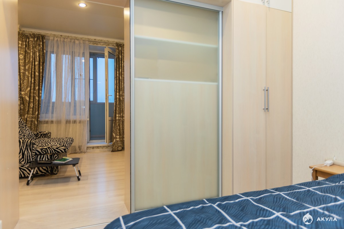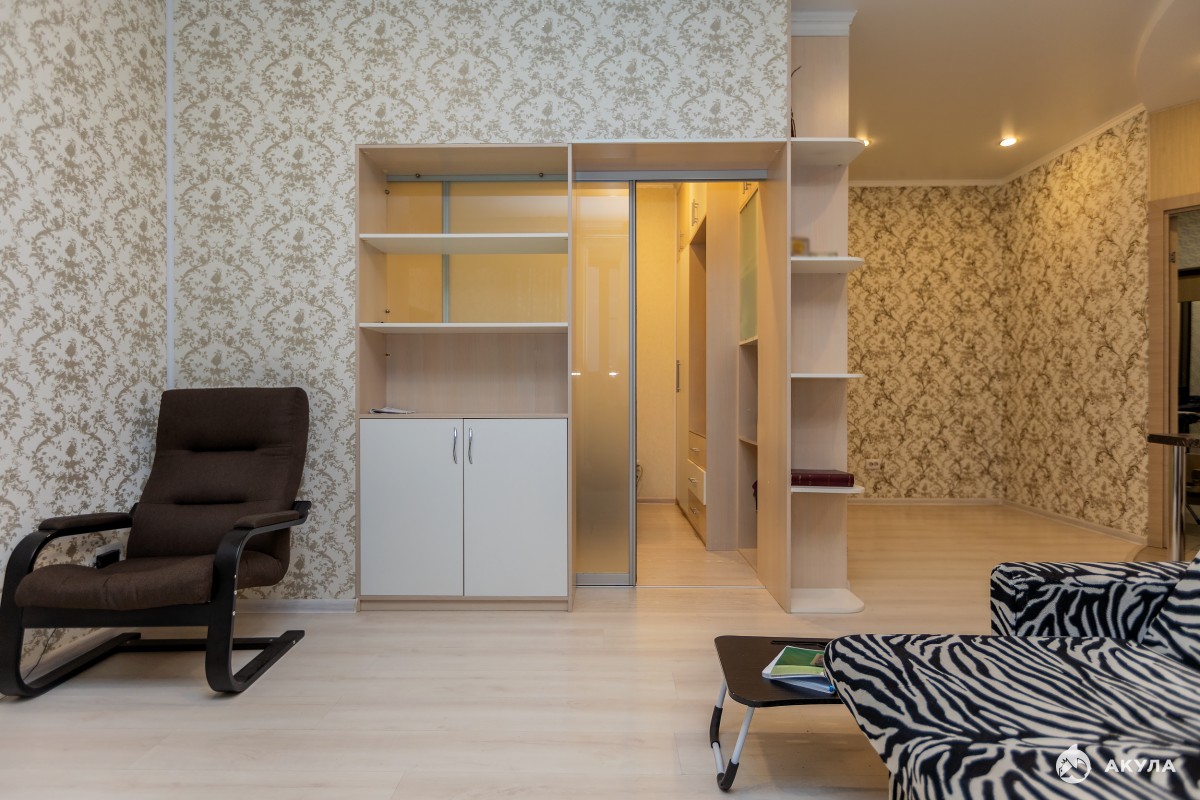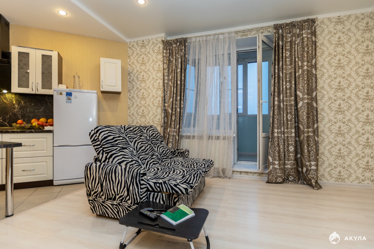 Квартира очень светлая с огромной 4-х метровой, застеклённой лоджией. Комната разделена на две части, одна из которых используется как спальня, а другая как кухня-гостиная. Общая площадь квартиры 43, 2 ка.метра, жилая комната —30 кв.м. Санузел большой, совмещенный. Квартира продается с бытовой техникой (стиральная машина-автомат, двухкамерный холодильник, СВЧ печь, электрическая плита с духовым шкафом, мощная вытяжка). В ванной и в зоне кухни установлена система теплый пол.