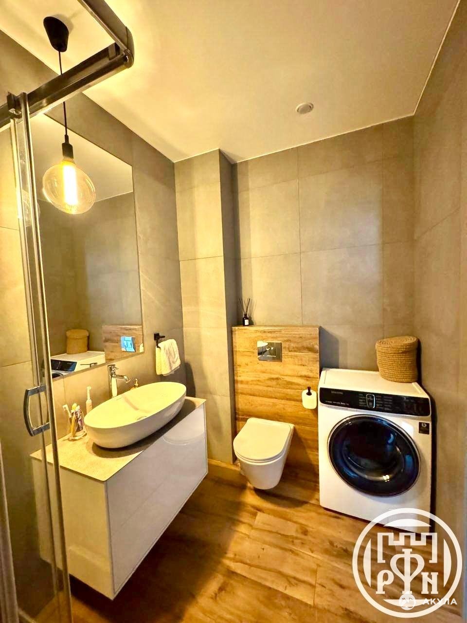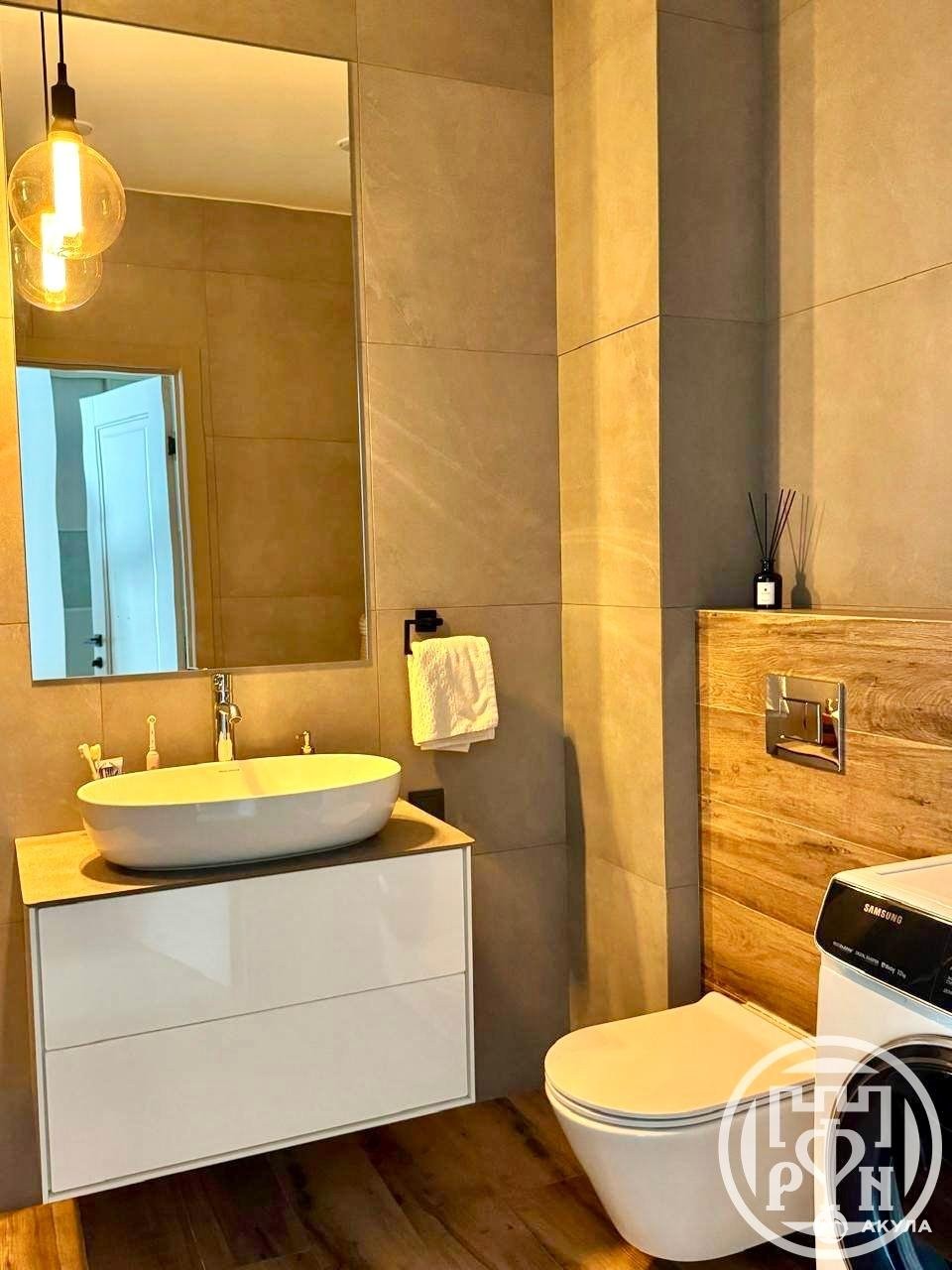 В ремонте использованы дорогостоящие материалы: пол - керамогранит Kerama Marazzi и водостойкий ламинат 33 класса, натяжные потолки, стены окрашены моющейся краской Dulux Bindo. В квартире присутствует вся необходимая техника премиум-класса: встроенная техника Bosch (холодильник, духовой шкаф, посудомоечная машина, индукционная панель), душевая система Grohe с термостатом и тропическим душем, стиральная машина Samsung, СОВ «Аквафор».