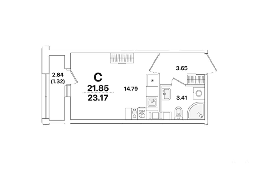 Комната 14.79 м, удобная прихожая 3, 65 м, совмещённый санузел 3, 56 м с местом для стиральной машины, светлая лоджия 2, 64 м 2 — уголок для утреннего кофе.