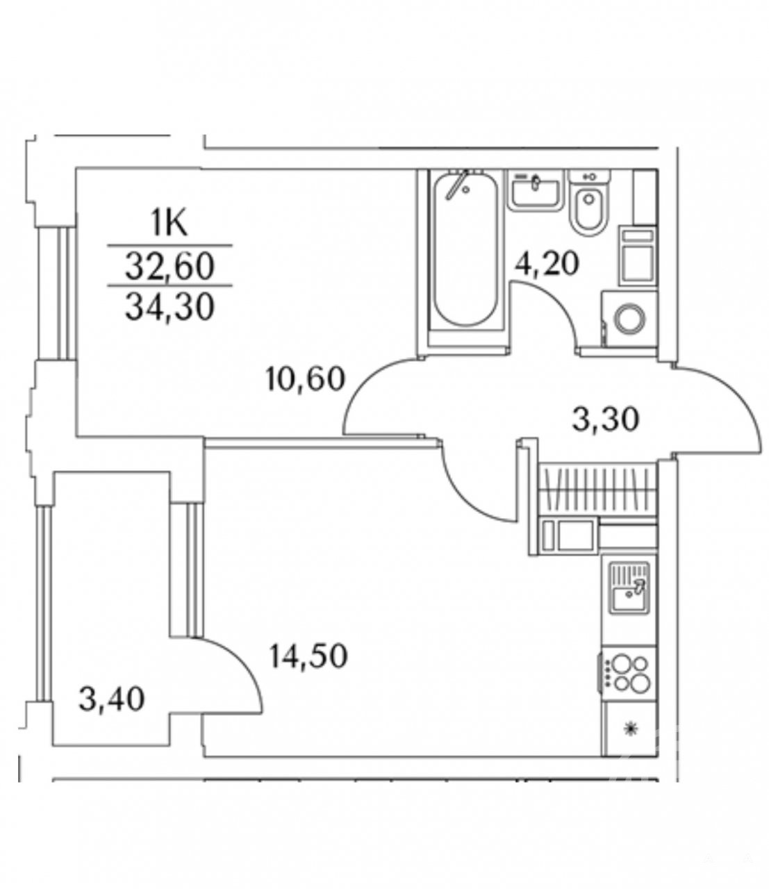 Общая площадь 32, 6 кв.м, из которых 10, 6 кв.м отведено под жилую площадь и 14.5 кв.м под кухонную зону, высота потолков 2, 75.