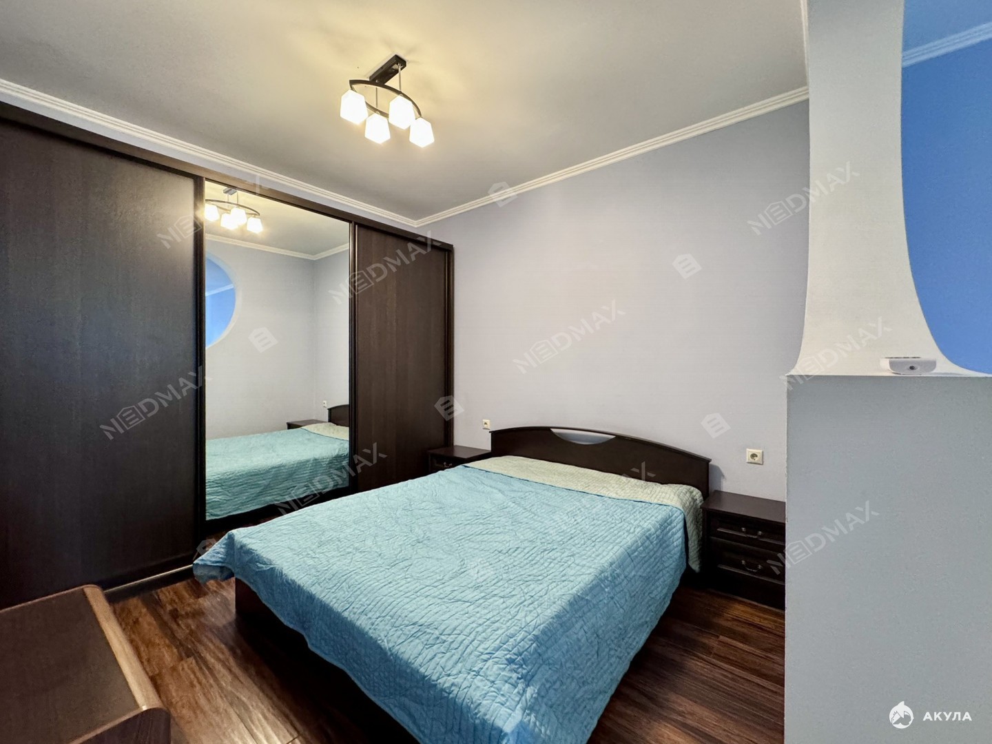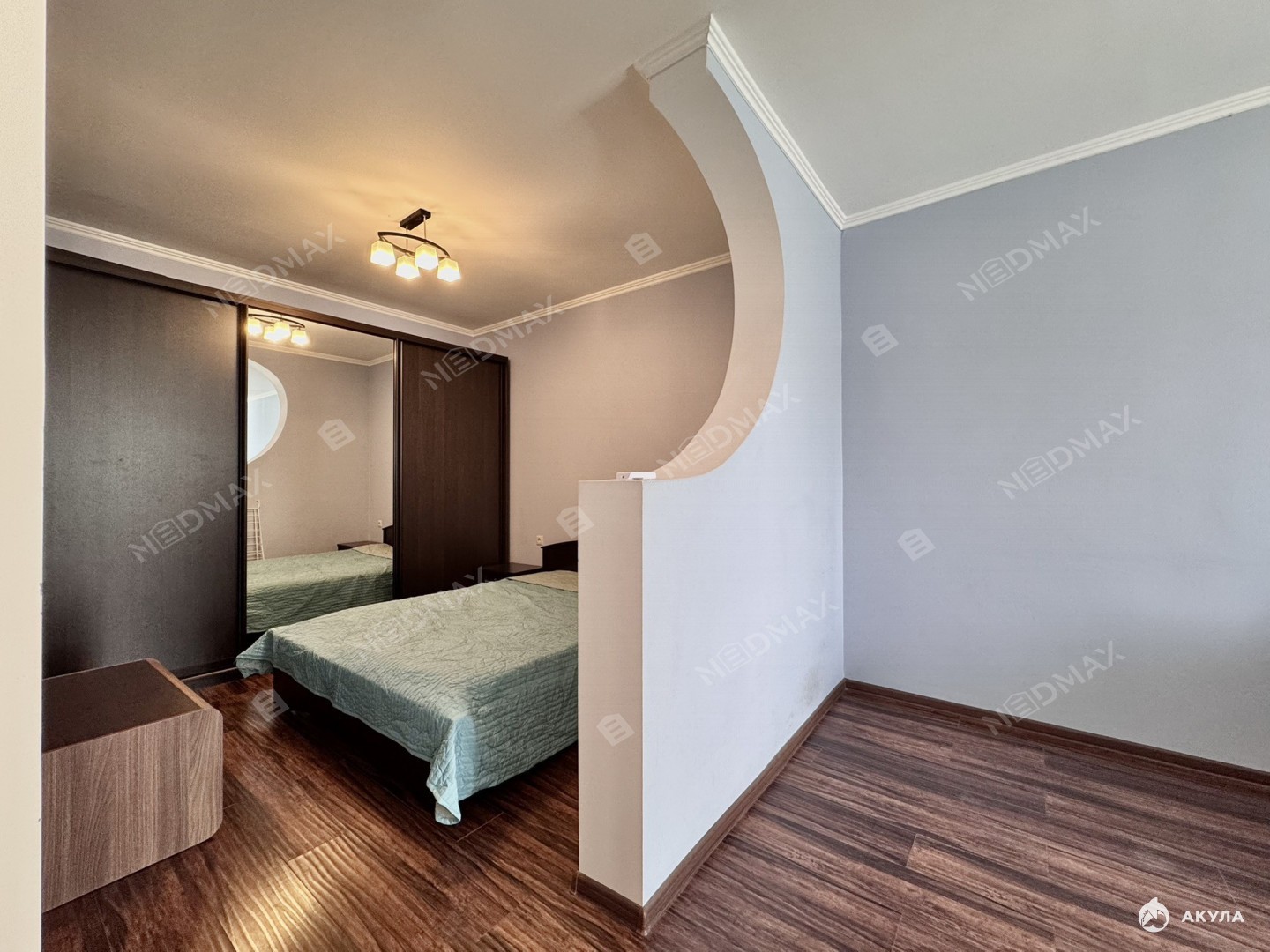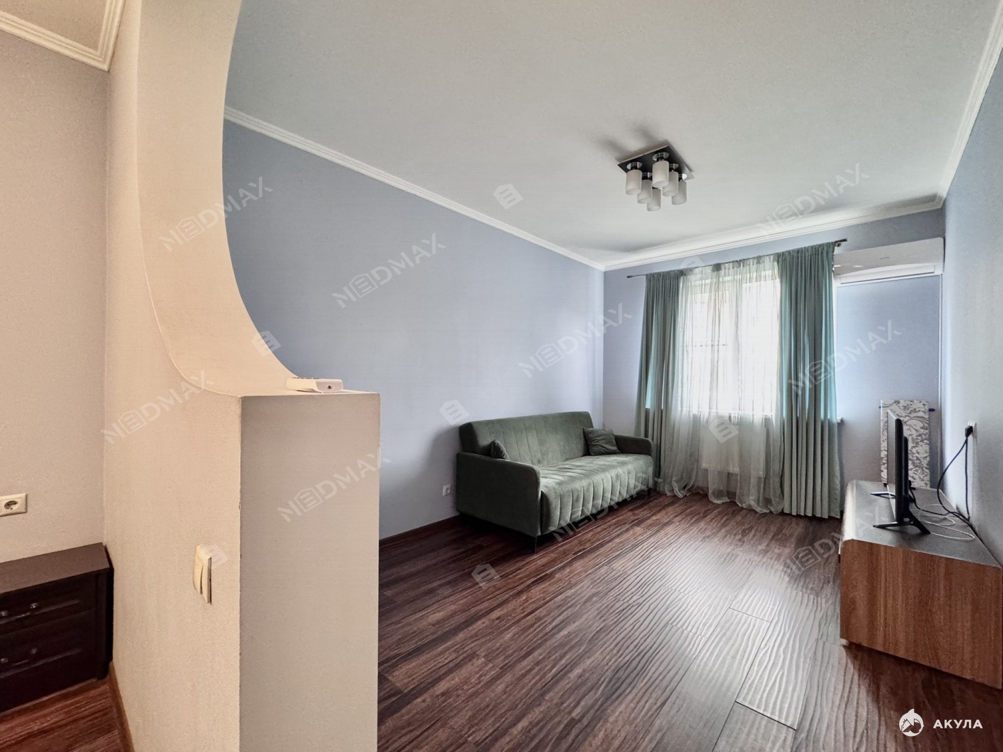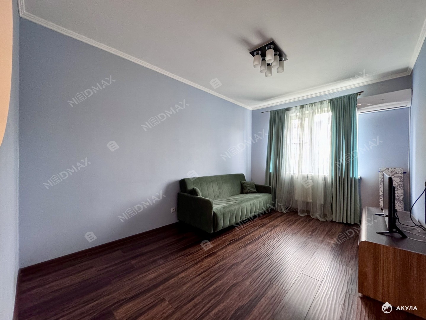Высокие потолки 2, 76 м, отопление через пол, квартира - теплая. В спальне установлен кондиционер. Из окон открывается вид на зеленый сквер.