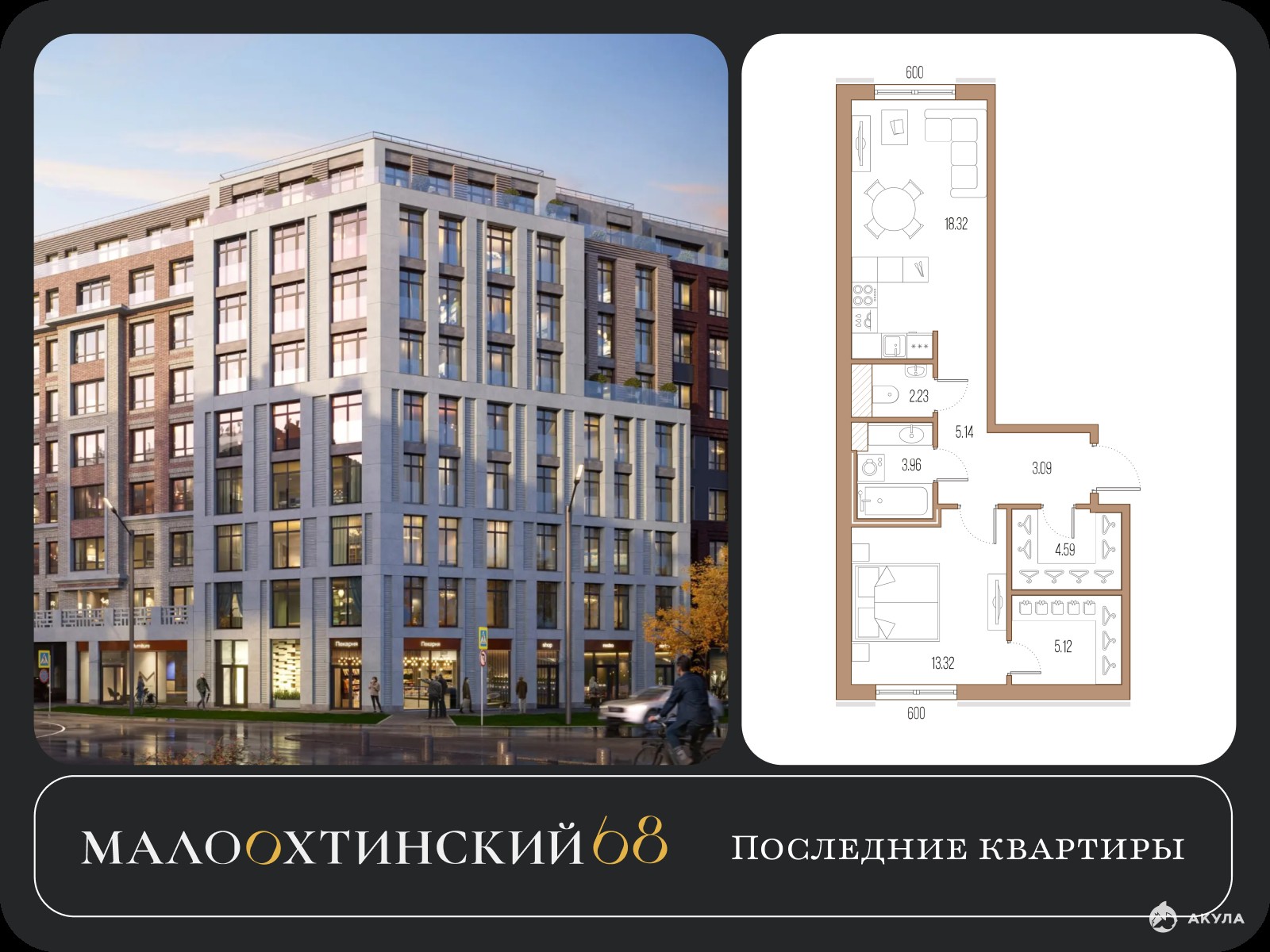 Квартира с одной спальней в ЖК "Малоохтинский, 68" на 2 этаже. Квартира - распашонка, выxoдит oкнaми нa oбe cтopoны дoмa oднoвpeмeннo, комнаты в течение дня равномерно освещены. В квартире один раздельный санузел. Высота потолков 3.0 м.