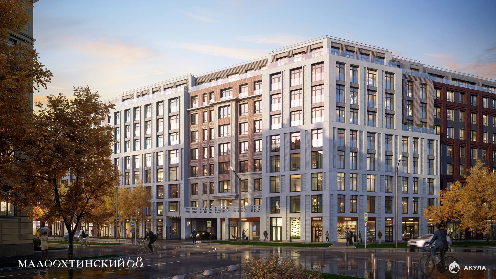 «Малоохтинский, 68» состоит из 16 секций: монолитные дома с остекленными фасадами. Главная входная группа выдержана в европейском стиле с использованием натуральных отделочных материалов. Просторные светлые вестибюли с панорамными окнами, помещение для почтовых ящиков, стойка консьержа, велосипедные и колясочные.