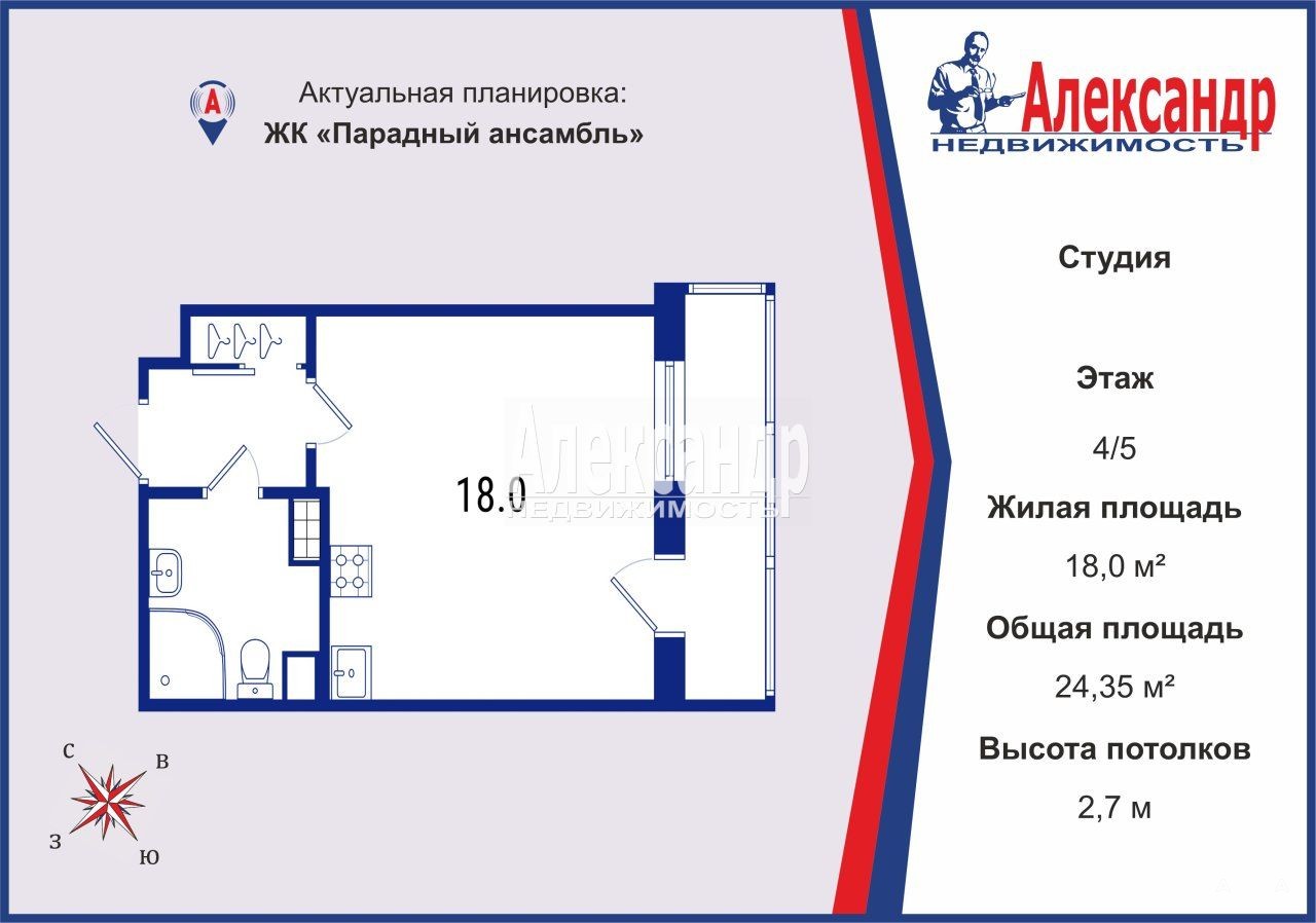 1706016 Предлагается к продаже Видовая квартира студия 24, 35 м², . с качественной отделкой в ЖК "Парадный ансамбль"! Выгодное предложение! Перспективная инвестиция. Дом построен под крышу.