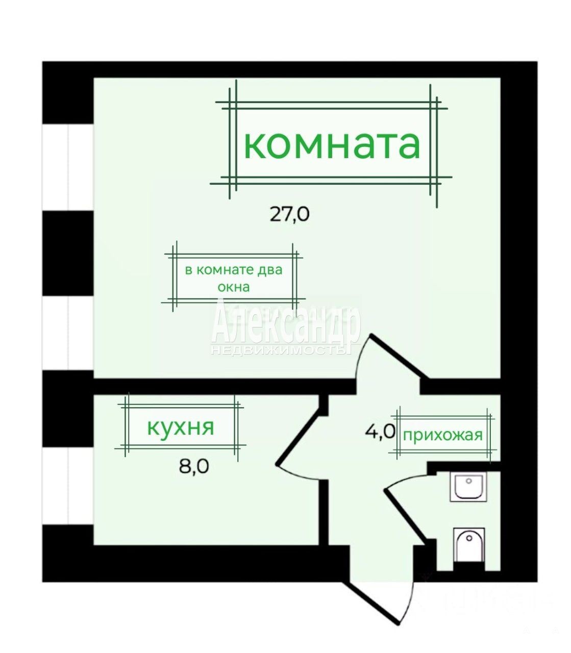 Общая площадь – 39, 3 кв.м. Комната 27 м, кухня – 8 м. Санузел совмещен.