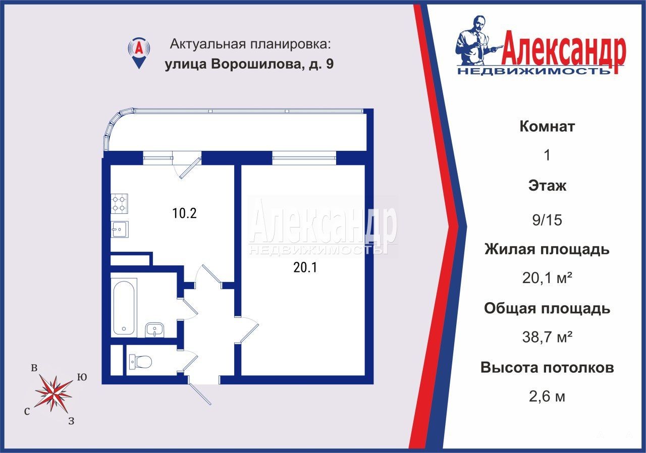 Очень удачная планировка - большая кухня - 10, 2м², с выходом на застекленную лоджию, просторная комната - 20, 1м², раздельный санузел.