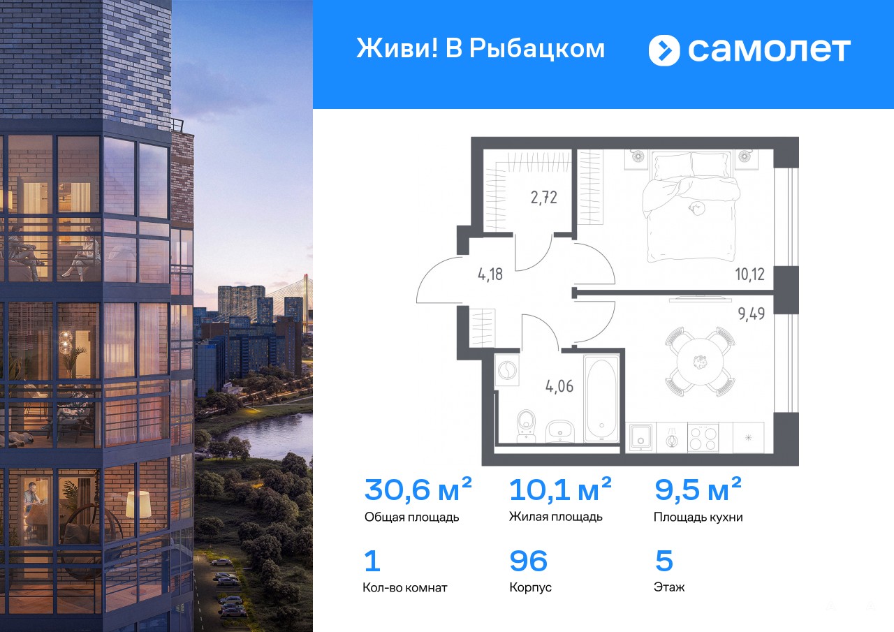 Строим кварталы для жизни с заботой о будущем. Предлагается 1-комнатная квартира комфорт-класса 30, 57 кв.м в корпусе 96 на 5 этаже, в ЖК «Живи! В Рыбацком»