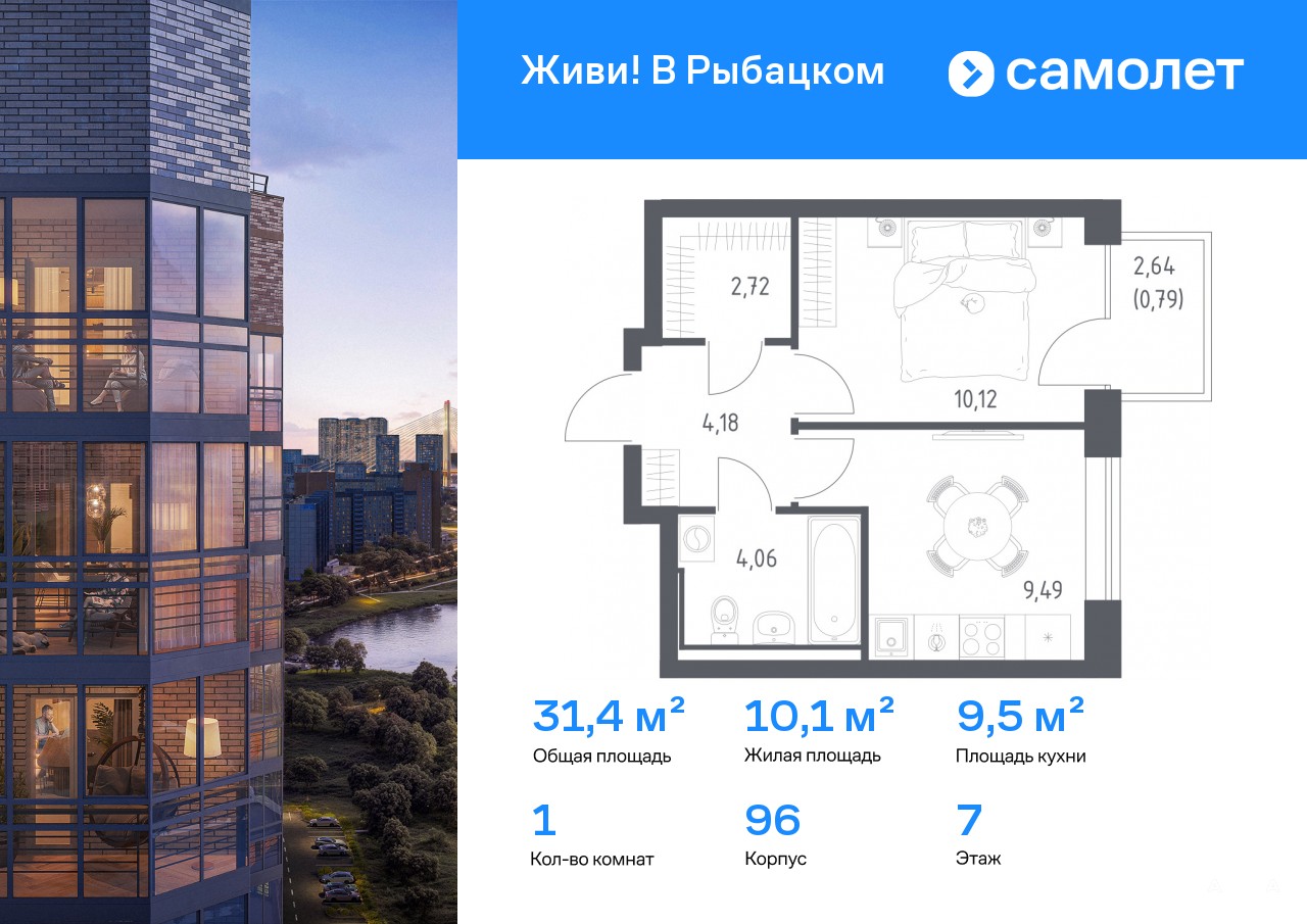 Строим кварталы для жизни с заботой о будущем. Предлагается 1-комнатная квартира комфорт-класса 31, 36 кв.м в корпусе 96 на 7 этаже, в ЖК «Живи! В Рыбацком»