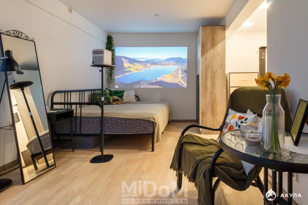 КВАРТИРА: Удачная планировка, которая позволит использовать квартиру для проживания 1-3 человек. Два окна в жилой комнате наполнят комнату светом. Там же приятный балкон с видом на зелень и реку. Установлена огромная двухспальная кровать. Два новых шкафа в комнате.