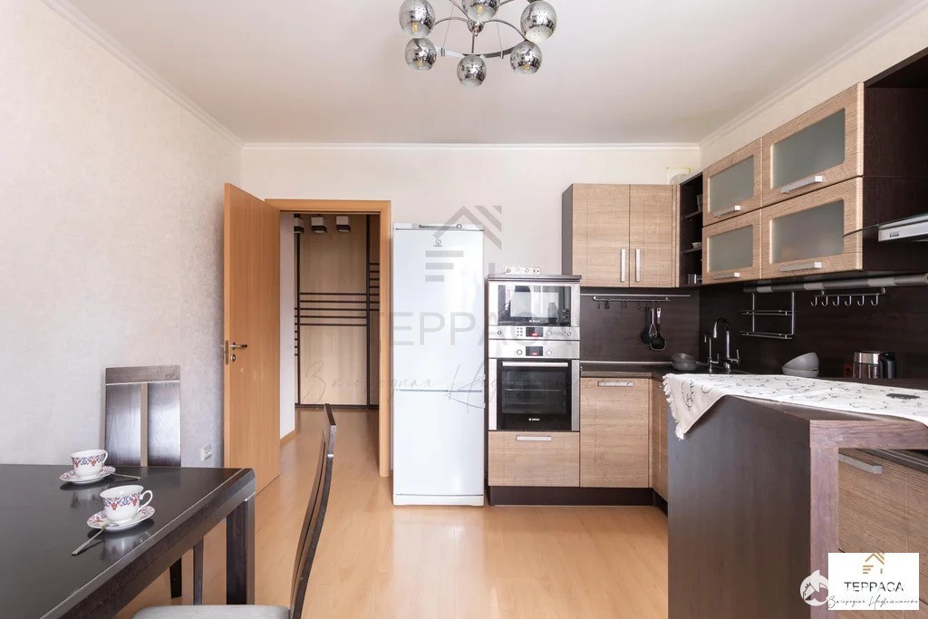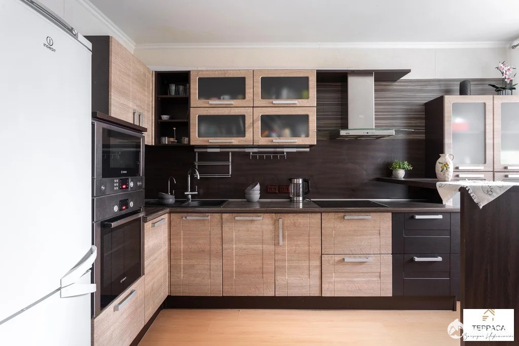 кухня 14, 8 кв.м.: куxонная мебель, варочная панель, холодильник, духовой шкаф, посудомойка, стулья, диван, стол;