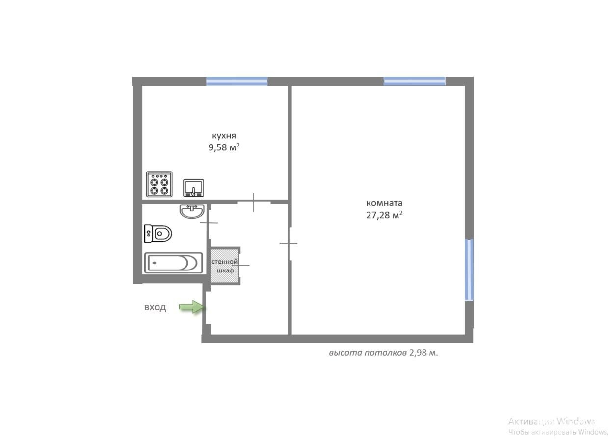 О квартире: большая 1-ком. квартира в кирпичном доме 1960 года постройки, высота потолков 3 м. Комната 27 кв.м., правильной квадратной формы, 2 больших окна на две стороны. Просторная кухня 9, 5 кв.м., так же с большим окном. Окна выходят в большой зеленый двор, с детской и спортивной площадкой. Сан.узел совмещенный, с полноценной ванной. Горячая вода-газовая колонка. В прихожей есть гардеробная. Чистая парадная. Хорошие соседи.