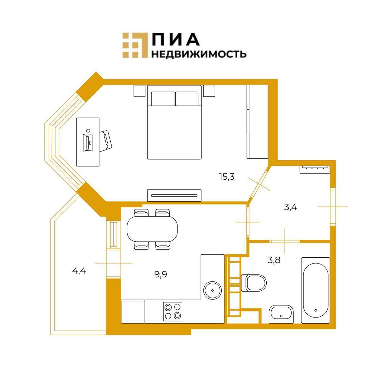 Прекрасное планировочное решение, просторная комната 15, 3кв.м. и кухня правильной формы 9, 9 кв.м.