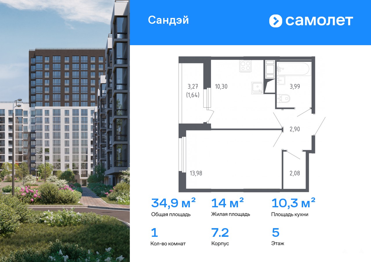 Строим кварталы для жизни с заботой о будущем. Предлагается 1-комнатная квартира комфорт-класса 34, 89 кв.м в корпусе 7.2 на 5 этаже, в ЖК «Сандэй»
