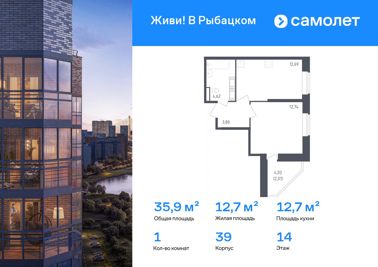 Строим кварталы для жизни с заботой о будущем. Предлагается 1-комнатная квартира комфорт-класса 35, 86 кв.м в корпусе 39 на 14 этаже, в ЖК «Живи! В Рыбацком»