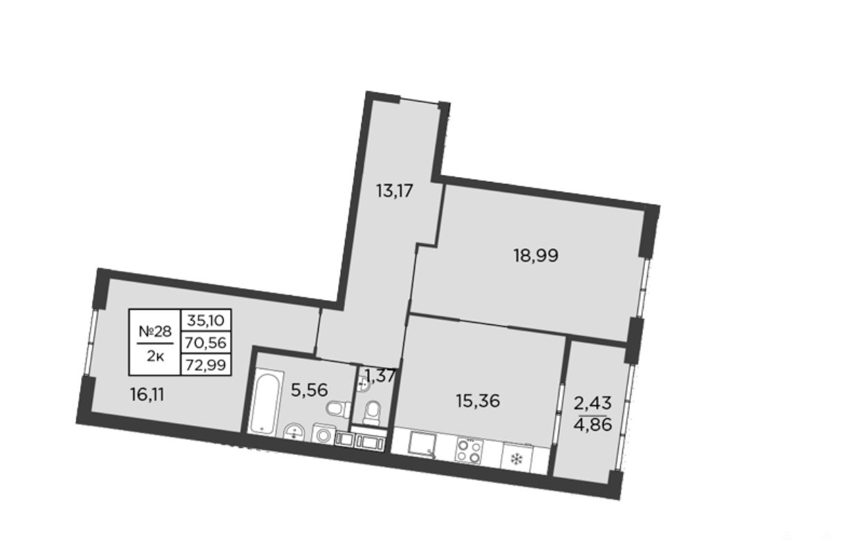 №341764 Предлагается квартира на 6-м этаже современного клубного дома: по планировке двухкомнатная, общей площадью 72, 99 м², с просторной кухней 15, 36 м² и двумя раздельными санузлами. Планировочное решение можно сохранить как есть, а при согласовании реализовать свободную планировку — от кухни-гостиной с выделенным рабочим местом до мастер-спальни с гардеробной, чтобы адаптировать пространство под личные сценарии жизни.
