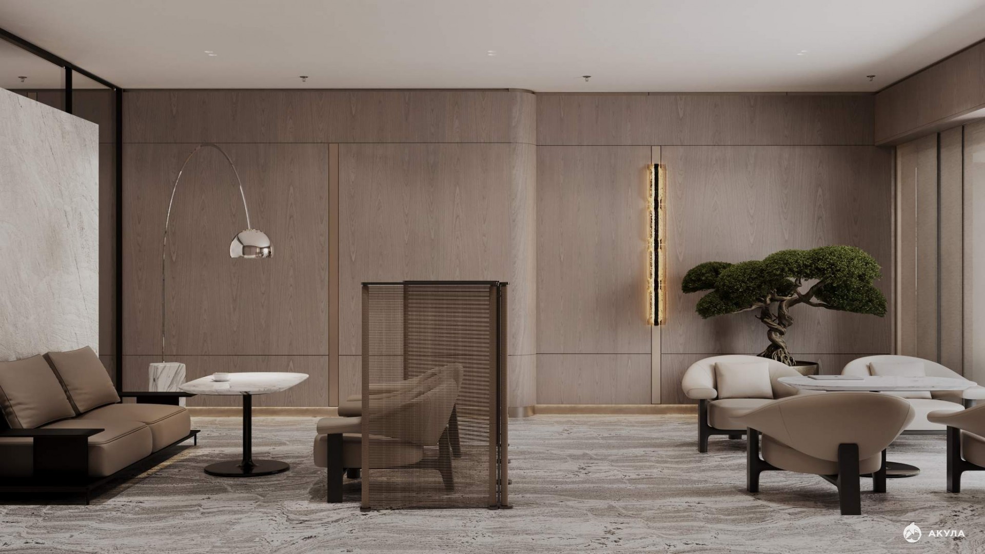 Лобби с зоной ресепшен, диванной группой и камином, SPA-центр с бассейном, fitness с тренажерами, залом для йоги и массажными кабинетами.