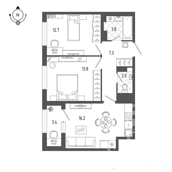 Преимущество этой квартиры – широкая остеклённая лоджия, на которой можно обустроить дополнительное место отдыха или хранения.