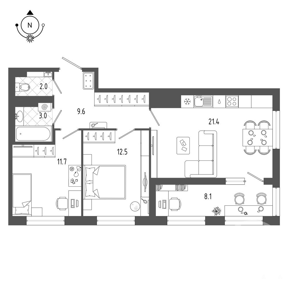 -Комната 12, 5+11, 7м2; - Ванная комната 3 , 0 м2.; -Туалет 2, 0 м2.;- Прихожая 9.6 м2.