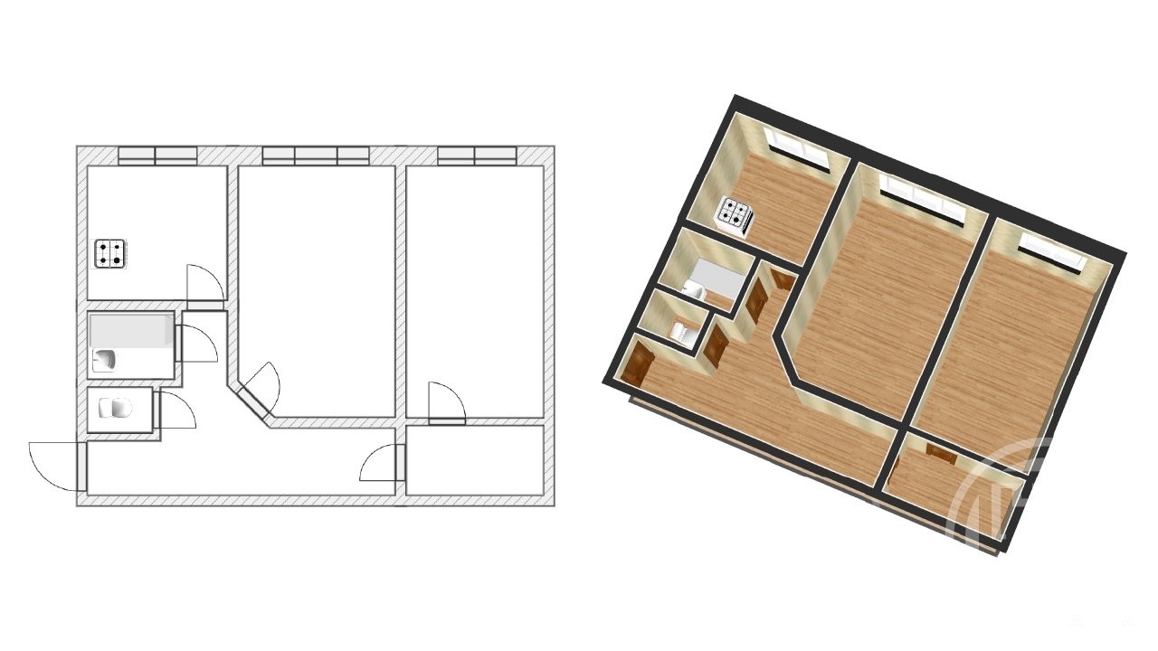 Общая площадь- 44, 9м., кухня - 5.8 м., комнаты изолированные, с\у раздельный.