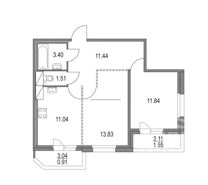 Кухня -11 м2, комнаты 13, 8м2 и 11, 84 м2.