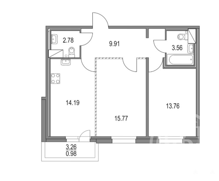 Кухня -14 м2, комнаты 15, 7 и 13, 7 м2.
