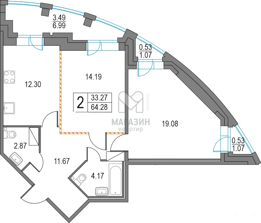 - Ванная комната - 4 м2 - Санузел - 3 м2