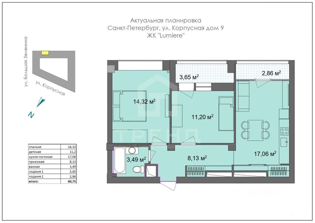 Квартира расположена на 9 этаже десятиэтажного монолитного дома, построенного в 2013 году. Высокие потолки (3 метра) создают ощущение простора и свободы. Общая площадь квартиры - 60 кв. м, из которых 25, 52 кв. м приходится на жилую площадь. Две изолированные комнаты (14, 32 кв. м и 11, 2 кв. м) идеально подойдут для семьи.