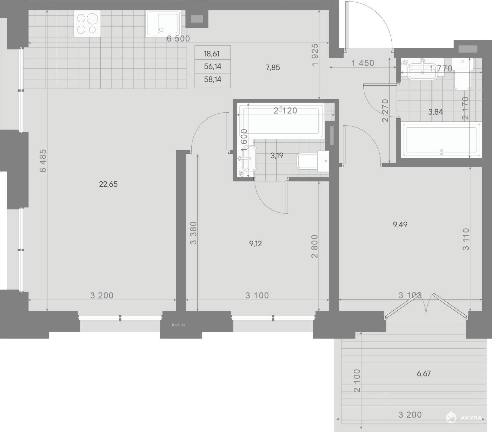 Жилая площадь 40.7 м2, кухня 8.72 м2, квартира без отделки.