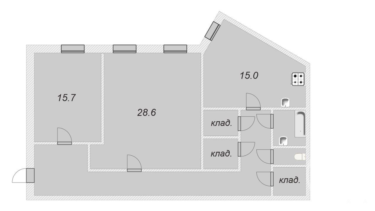 Комнаты 15, 7 кв.м, 28, 6 кв.м. Кухня 15, 0