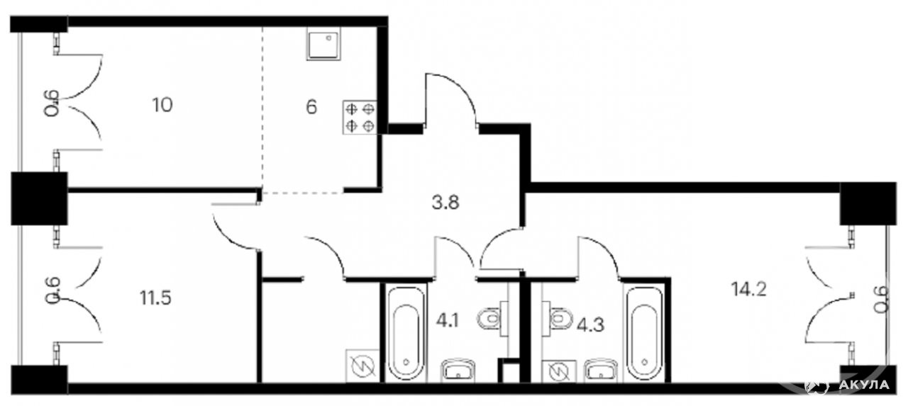 В квартире 2 санузла по 4, 2м2+ 4, 1 м2