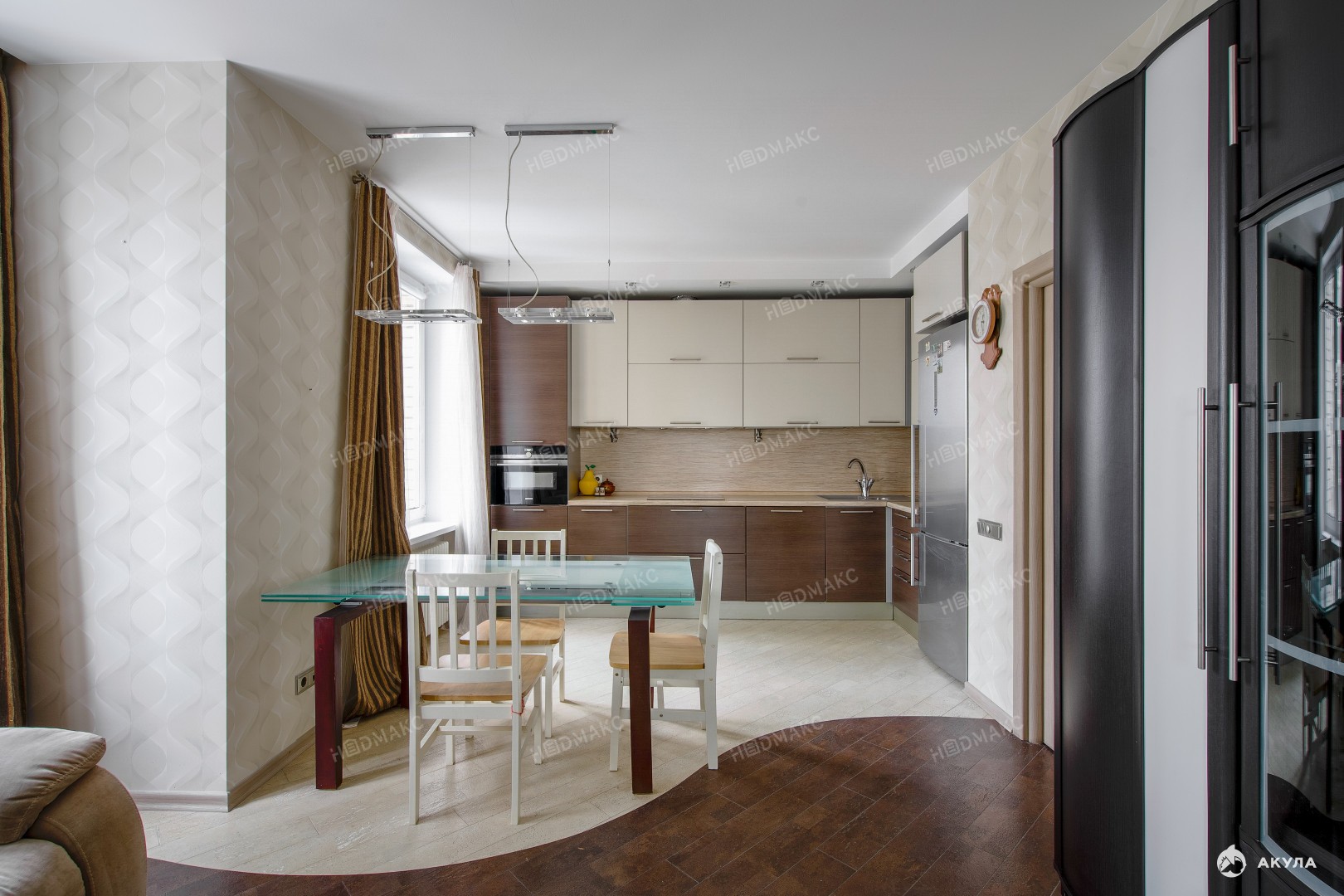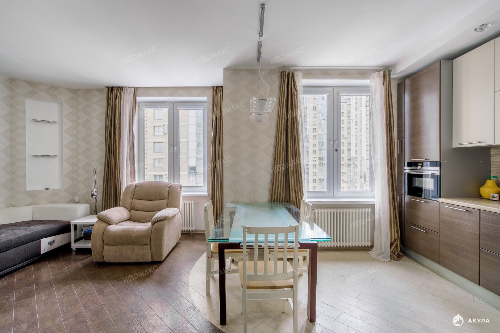 кухня-гостиная с выходом на застекленный балкон (окна на запад и север);