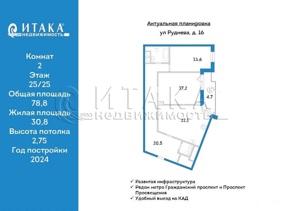 Транспортная развязка позволяет быстро добраться в любую точку города. Рядом – две станции метро, трамвайные линии и основные магистрали. При этом тихая улица Руднева и близость парков обеспечивают спокойную атмосферу.