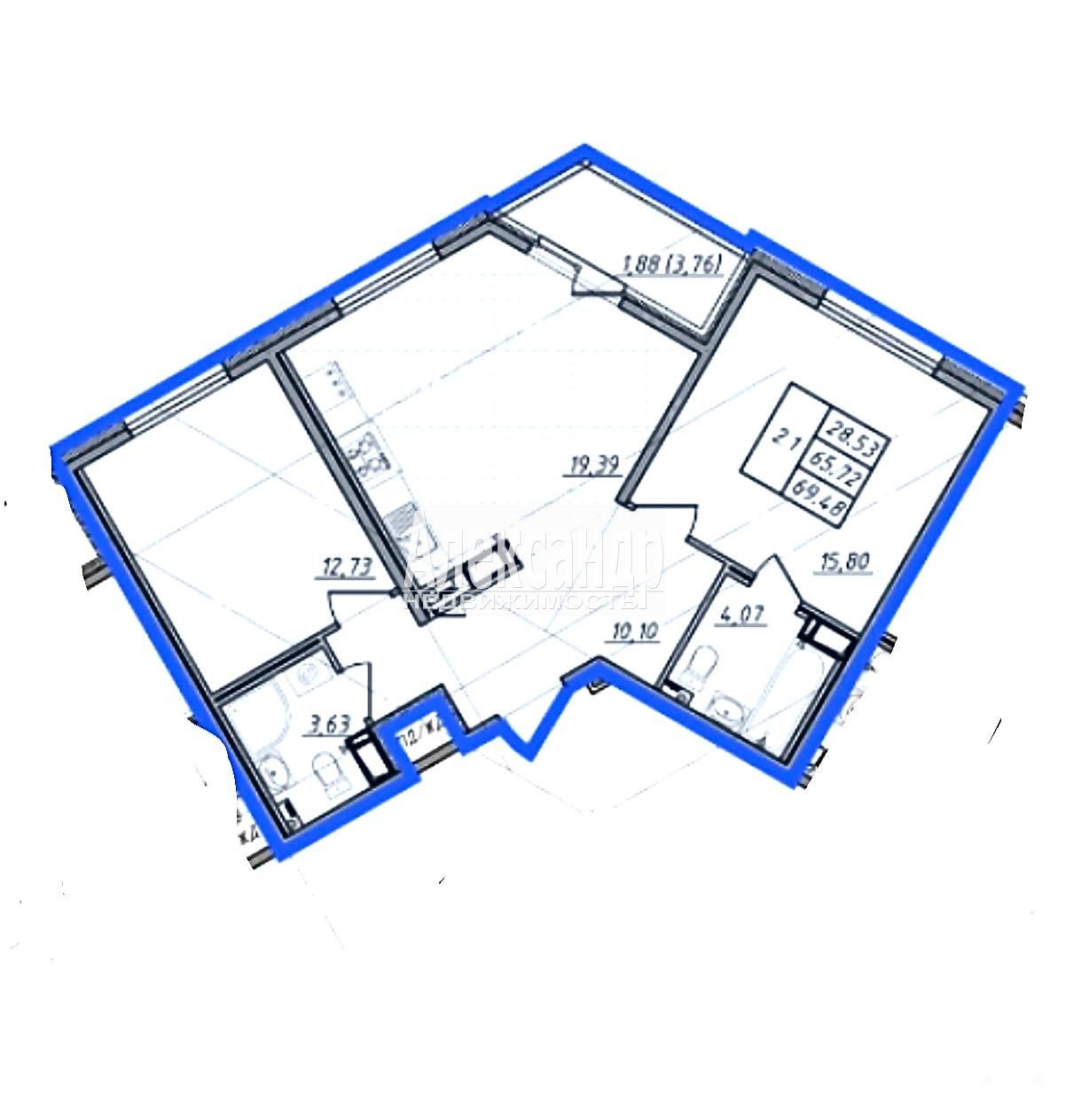 Квартира удобной планировки: комнаты квадратные 12.73 и 15.8 м²., - мастер спальня; большая кухня гостиная почти 20 м².; функциональная прихожая; второй с/узел с душевой.