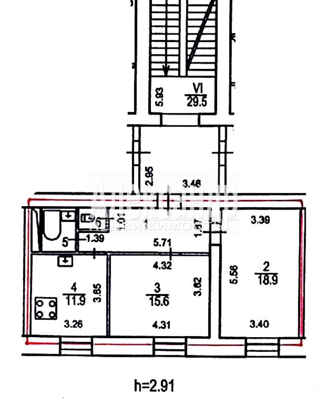 Двухкомнатная квартира состоит из двух изолированных комнат площадью 15, 6 и 18, 9 м. кв., кухней площадью 11, 9 метров и совмещенным санузлом. Выcота потолка 2, 91 м.