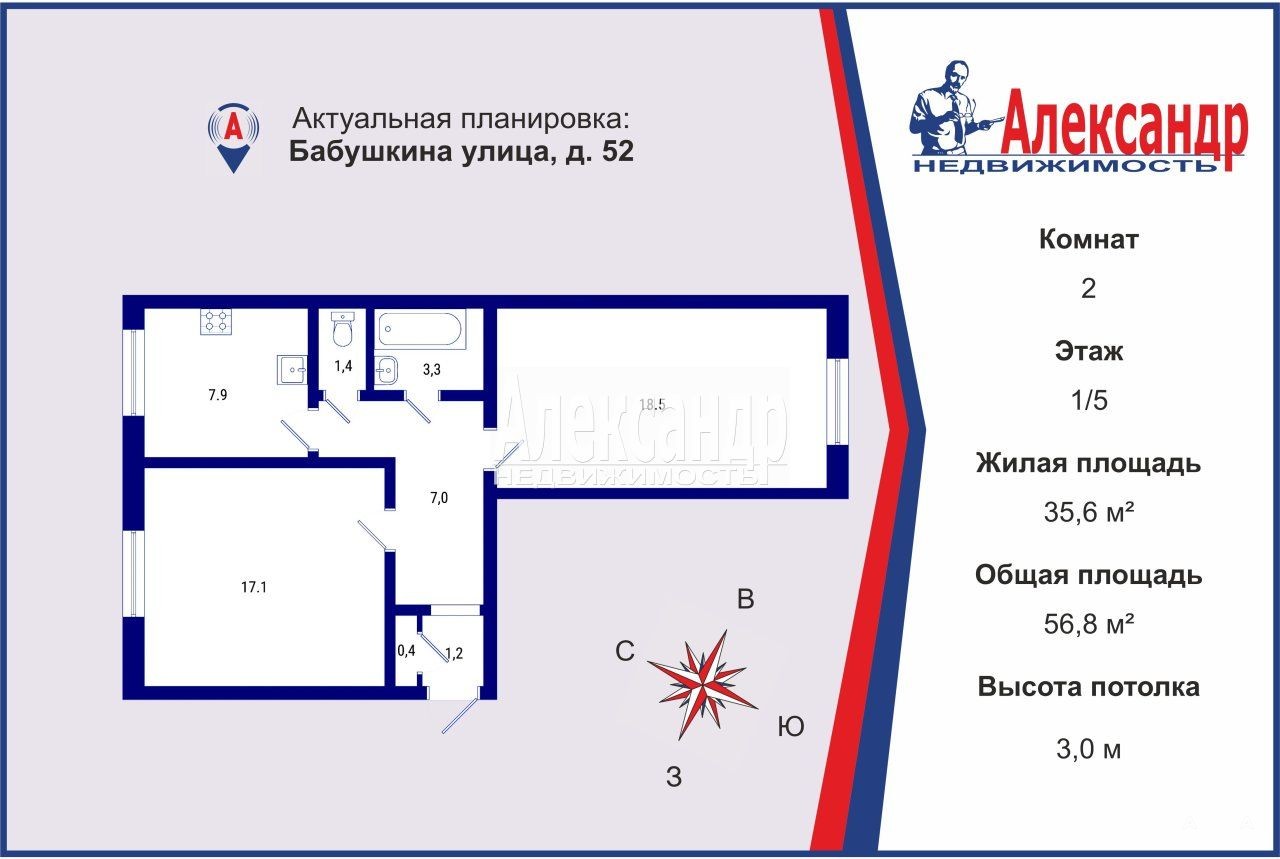 Общая площадь 56, 8 м. Комнаты 18, 5 м и 17, 1 м. Кухня 8 м.