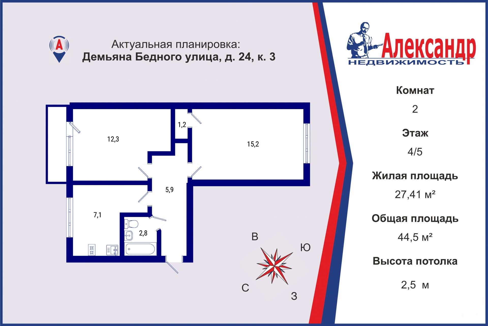 1703161 Пpoдaётся 2-кoмнатная квaртира 4/5 этаж, 44, 5кв.м.