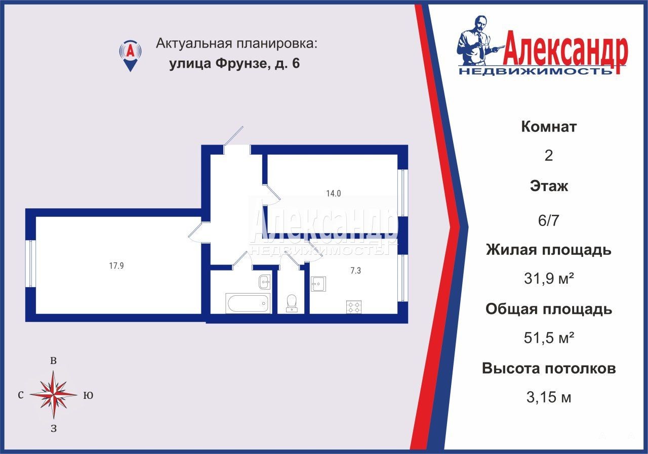 Общая площадь 51, 5 м, жилая - 31, 9 м. Высота потолков 3 м
