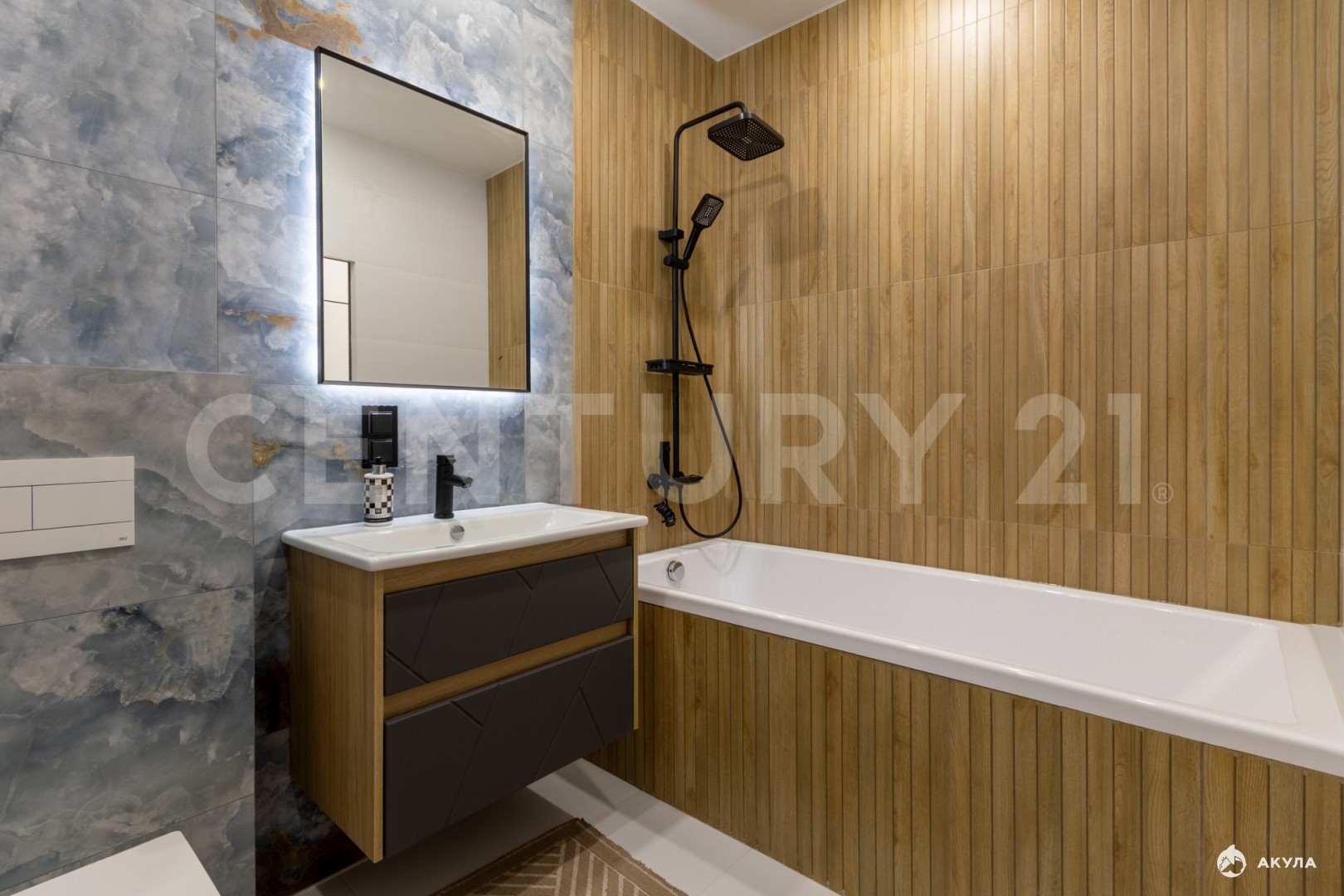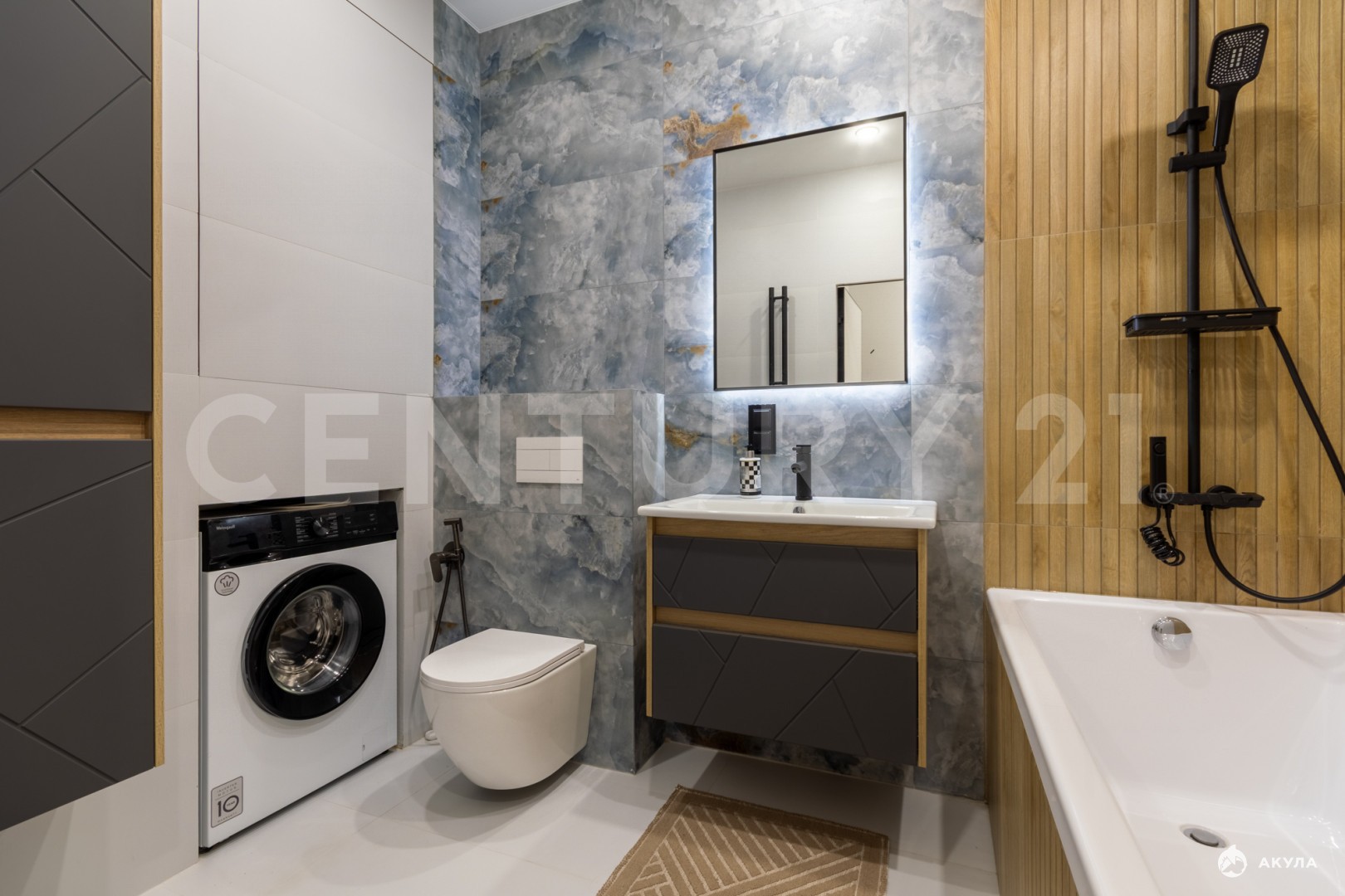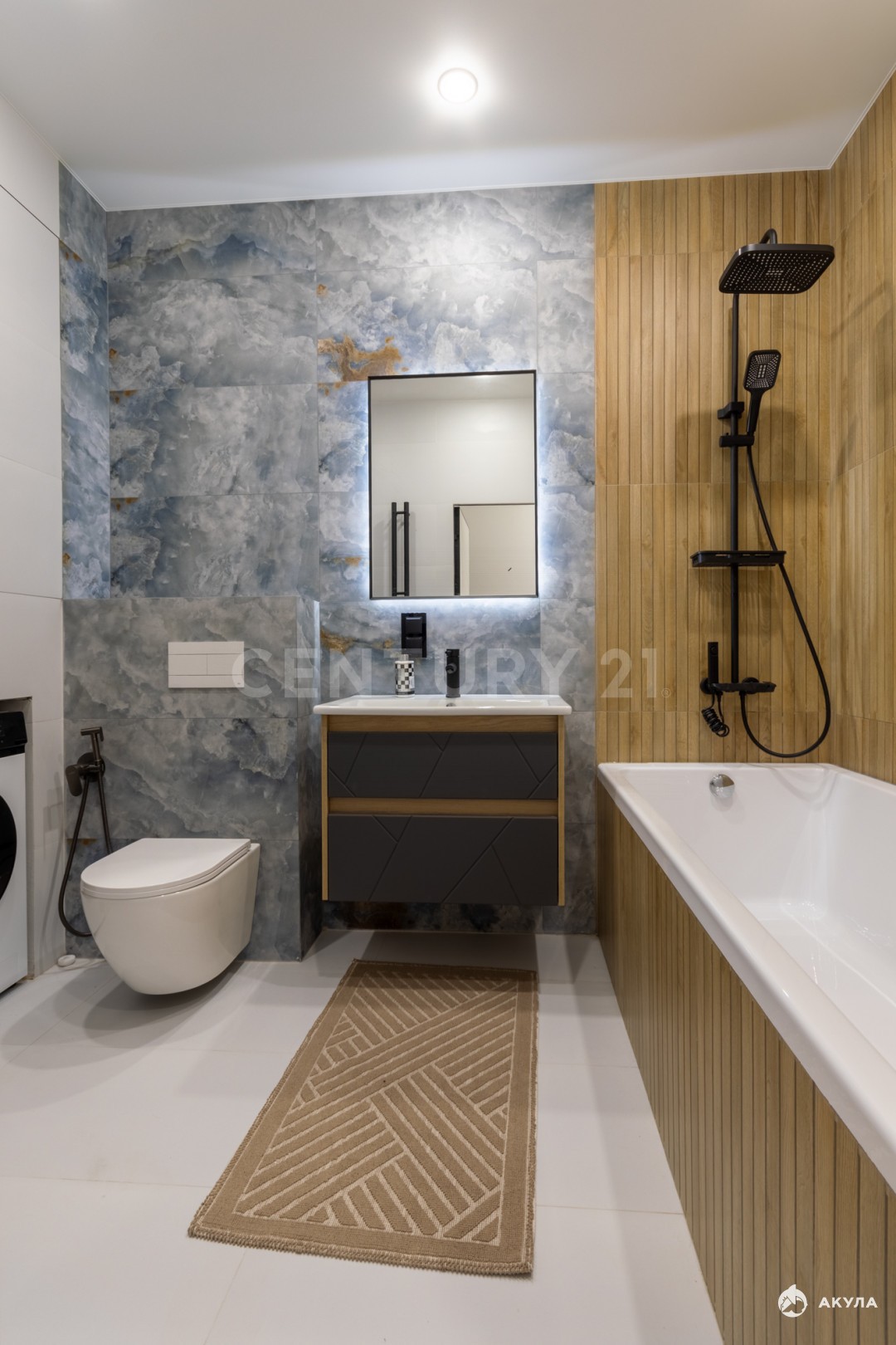 • Входная дверь от HogoDoors, межкомнатные двери Morelli, сантехника Tokito и Oli, на стенах и полу в санузлах керамогранит, тёплый пол, большая ванна 180х80см, стены окрашены премиальной краской в едином стиле, кухонный гарнитур укомплектован встроенной техникой