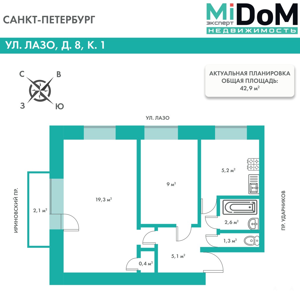 - Площадь: 42, 9 м² + балкон 2, 1 м².