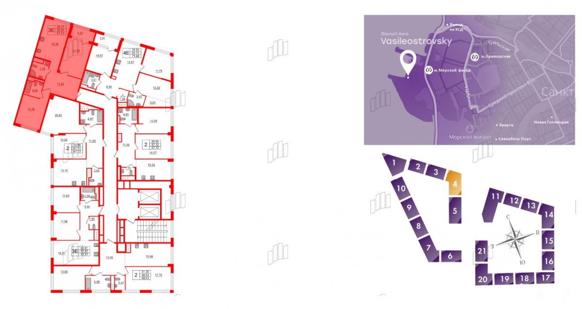 Инфраструктура района развита: рядом находится школа и детский сад, работают поликлиника, спорткомплекс, гипермаркеты Лента и Перекресток, аквапарк Вотервиль. Метро «Приморская» находится в 10 минутах транспортом. Строительство метро Морской фасад возле дома запланировано на 2030 г.