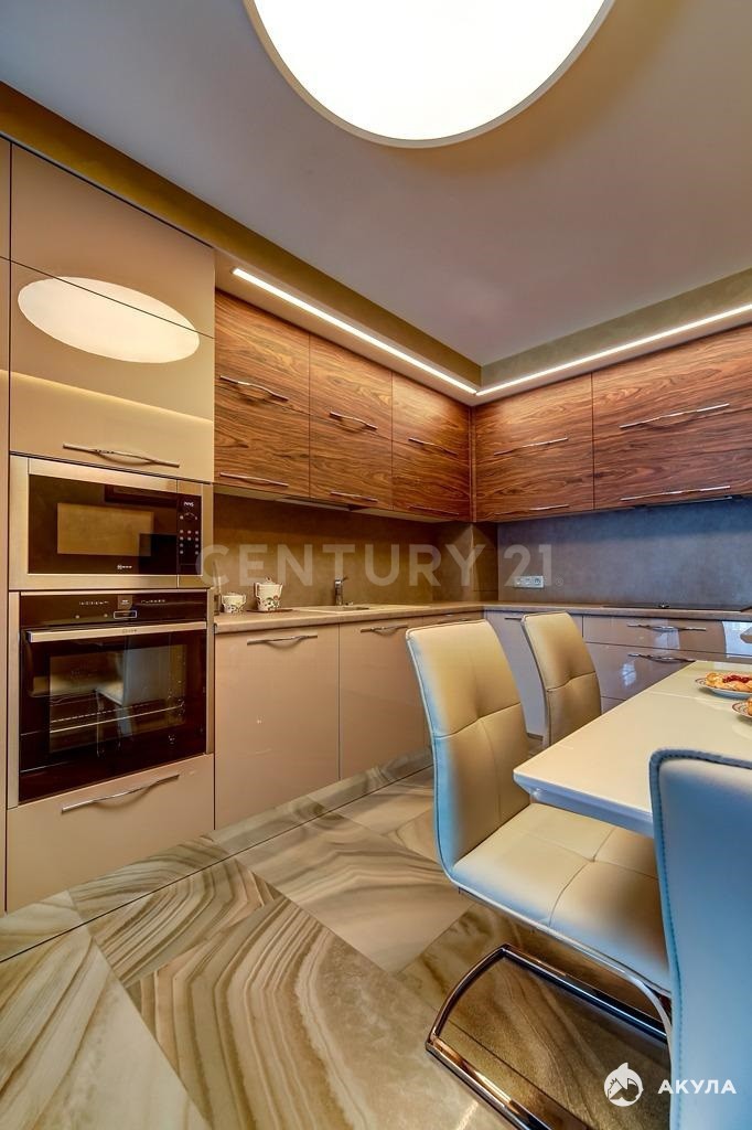 - Кухня — индивидуальный проект: корпус Egger, глянцевые и шпонированные фасады, влагостойкая столешница, фартук из тонкого керамогранита