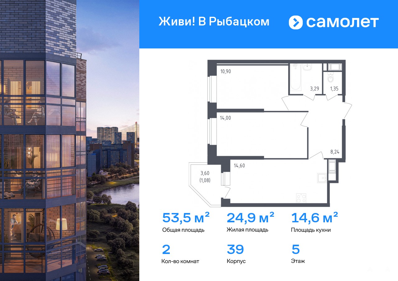 Строим кварталы для жизни с заботой о будущем. Предлагается 2-комнатная квартира комфорт-класса 53, 46 кв.м в корпусе 39 на 5 этаже, в ЖК «Живи! В Рыбацком»